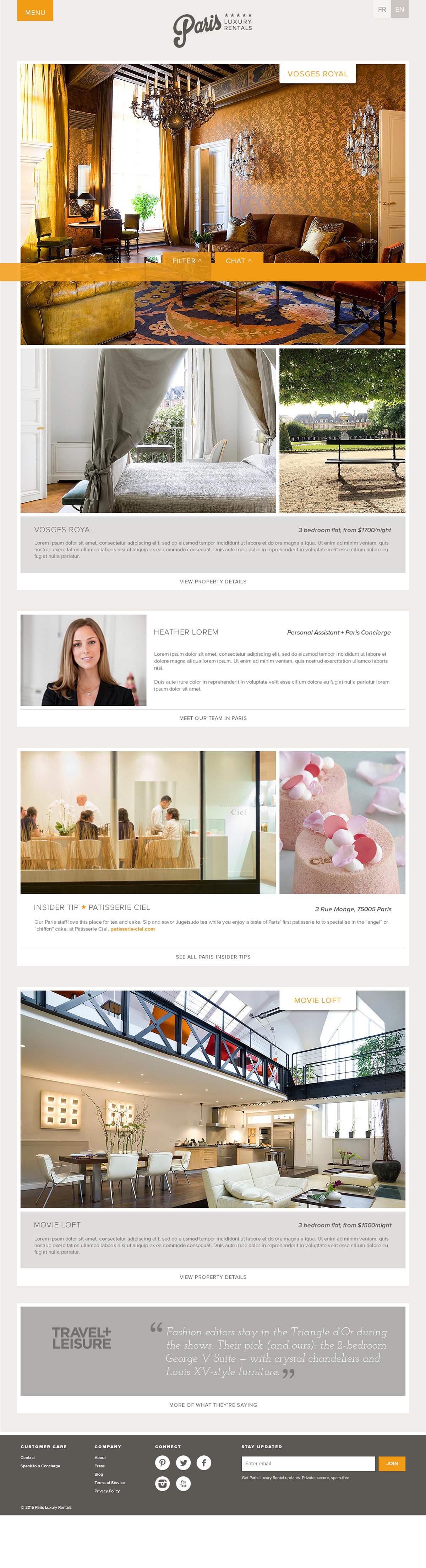 Paris Luxury Rentals needed to redesign their website in order to better illustrate their 5-star accommodations. We changed the site to feel more like a travel magazine to be inline with the way their high net worth customers prefer to browse.